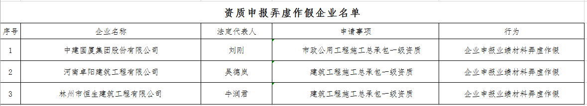 经实地核查,中建国厦集团股份有限公司、河南卓阳建筑工程有限公司、林州市恒生建筑工程有限公司等3家建设工程企业在采用告知承诺方式申请资质过程中存在弄虚作假行为。根据《中华人民共和国建筑法》《中华人民共和国行政许可法》及《建设工程企业资质申报弄虚作假行为处理办法》(建市〔2011〕200号)等规定,决定对中建国厦集团股份有限公司等3家建设工程企业予以通报批评,不批准其资质申请,并将其不良行为在全国建筑市场监管公共服务平台予以公布,自本通报印发之日起1年内不受理上述企业申请该项行政许可。