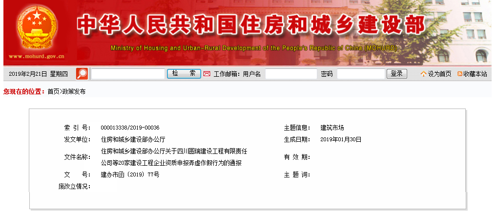 住房和城乡建设部办公厅关于四川圆瑞建设工程有限责任公司等20家建设工程企业资质申报弄虚作假行为的通报
