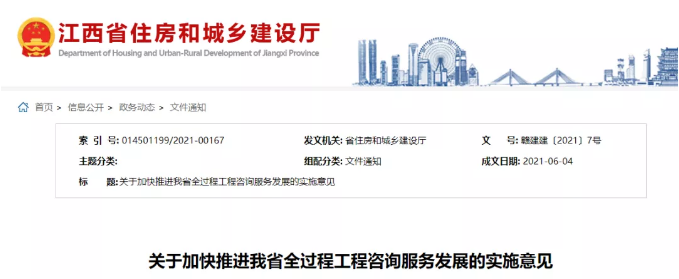 近日,江西省住房城乡建设厅、省发展改革委联合出台《关于加快推进我省全过程工程咨询服务发展的实施意见》在房屋建筑和市政基础设施领域加快推进全过程工程咨询服务发展。