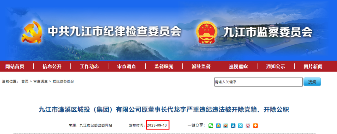 刚刚(9月13日),九江市纪委监委通报:九江市濂溪区城投(集团)有限公司原董事长代龙宇被“双开”。