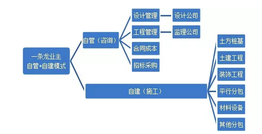 一条龙业主自管+自建模式的优点是,项目推进快,成本透明,市场应变灵活等优点,是在缺乏全过程咨询服务、市场主体诚信不足的条件下,中国开发商创造的优秀项目管理模式,目前为房地产企业所通用。