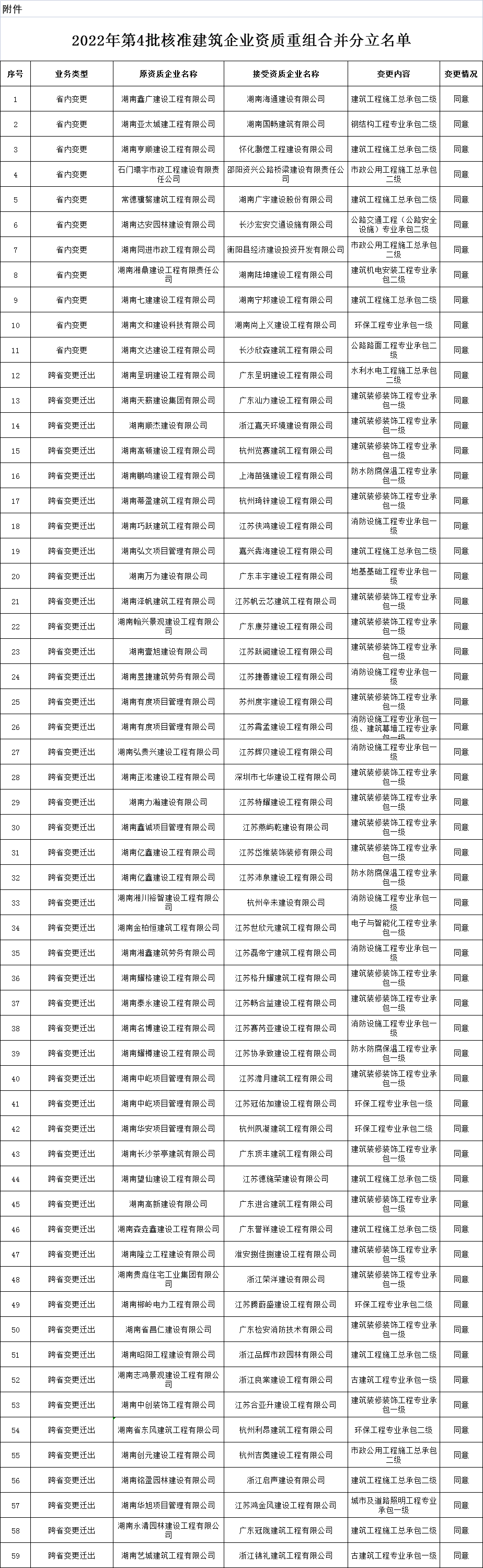 近日,湖南省住建厅发布关于2022年第4批建筑业企业发生重组合并分立等情况资质核准名单的公告。湖南鑫广建设工程有限公司等56家企业成功重组、合并、分立资质,其中11家企业省内变更资质,45家企业跨省变更迁出资质,当中44家迁入地分别是江苏、广东、浙江,还有1家迁入上海。