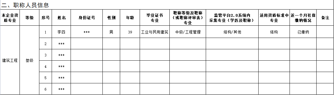 2.资质技术负责人施工技术管理工作经历、职称(或注册执业资格)专业等级、个人业绩、社会保险缴纳情况是否符合资质标准要求;
