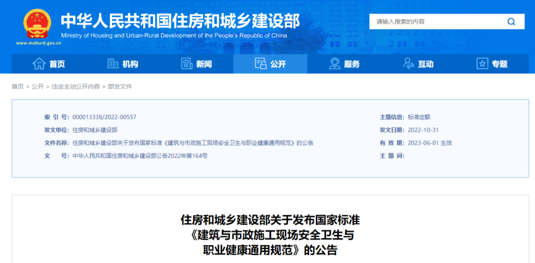 11月17日,住建部发布国家标准《建筑与市政施工现场安全卫生与职业健康通用规范》。自2023年6月1日起实施。本规范为强制性工程建设规范,全部条文必须严格执行。同时废止了一大批现行工程建设标准相关强制性条文。