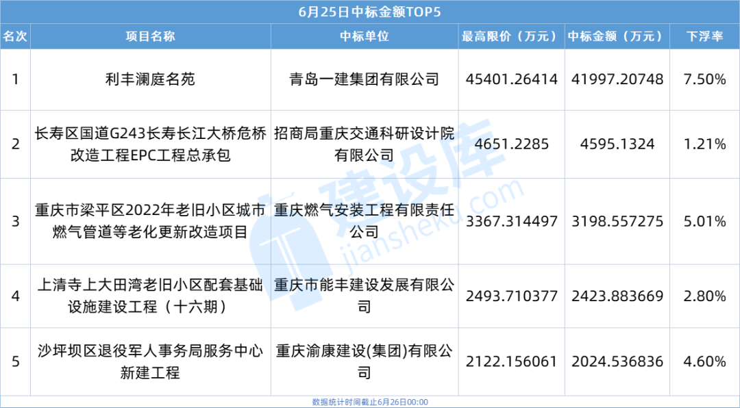 6月25日重庆中标详情】建设库大数据综合服务平台统计,截止到2023年6月26日00:00重庆公共资源交易网中标公示项目27个,其中施工项目20个,勘察设计1个,监理1个,其他5个,出现废标情况的项目有5个。