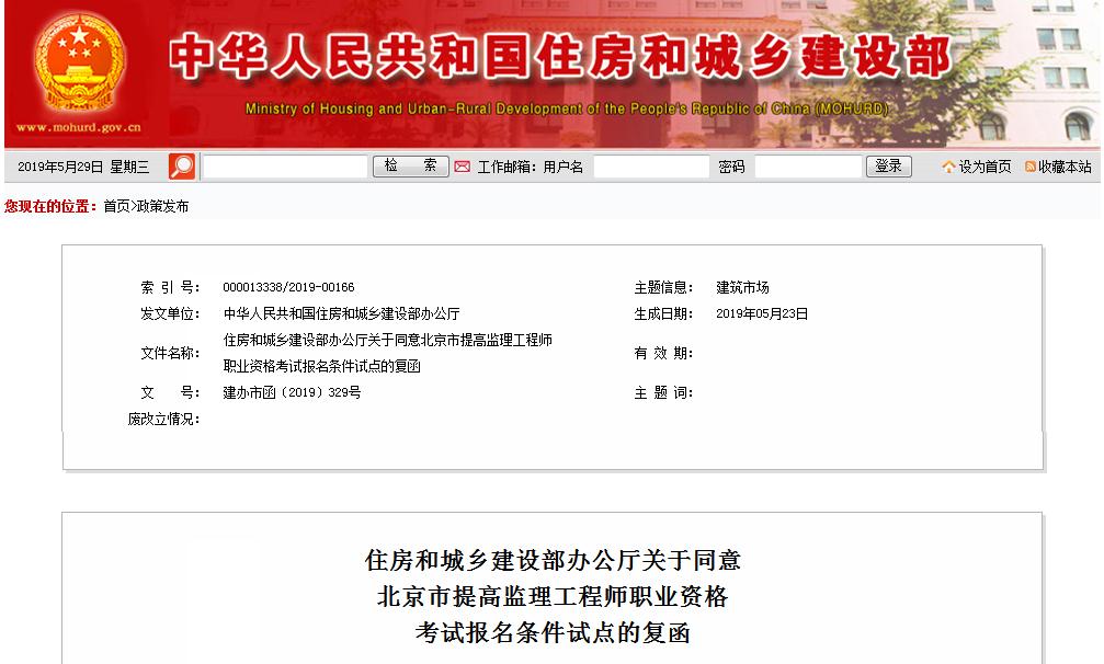 5月27日,住建部官网再发复函,同意北京市开展“提高监理工程师职业资格考试报名条件”试点,自2019年5月31日开始。