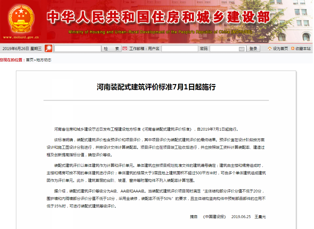 河南省住房和城乡建设厅近日发布工程建设地方标准《河南省装配式建筑评价标准》,自2019年7月1日起实施。