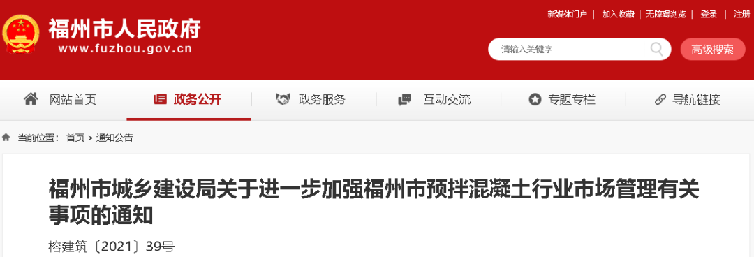 此前,福州市人民政府公开转发了《福州市城乡建设局关于进一步加强福州市预拌混凝土行业市场管理有关事项的通知》。通知要求: