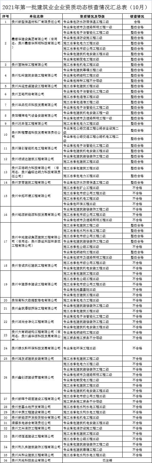 本次共计核查36家建筑业企业,经审核,符合标准1家,在整改期间自行注销资质1家,整改合格13家,不符合资质标准企业21家,根据《建筑业企业资质管理规定》第二十八条,市住建局研究决定,撤回贵州中拓环境工程有限公司等21家不符合资质标准的施工企业相应资质,并向社会公布。