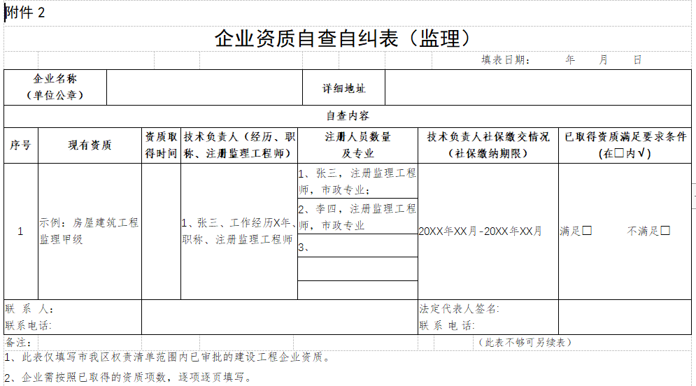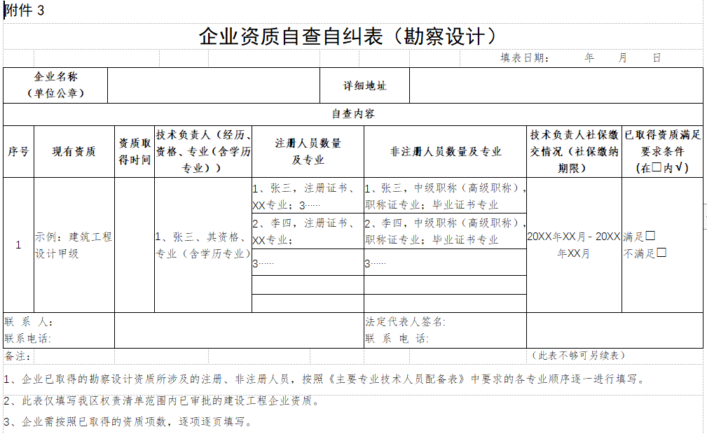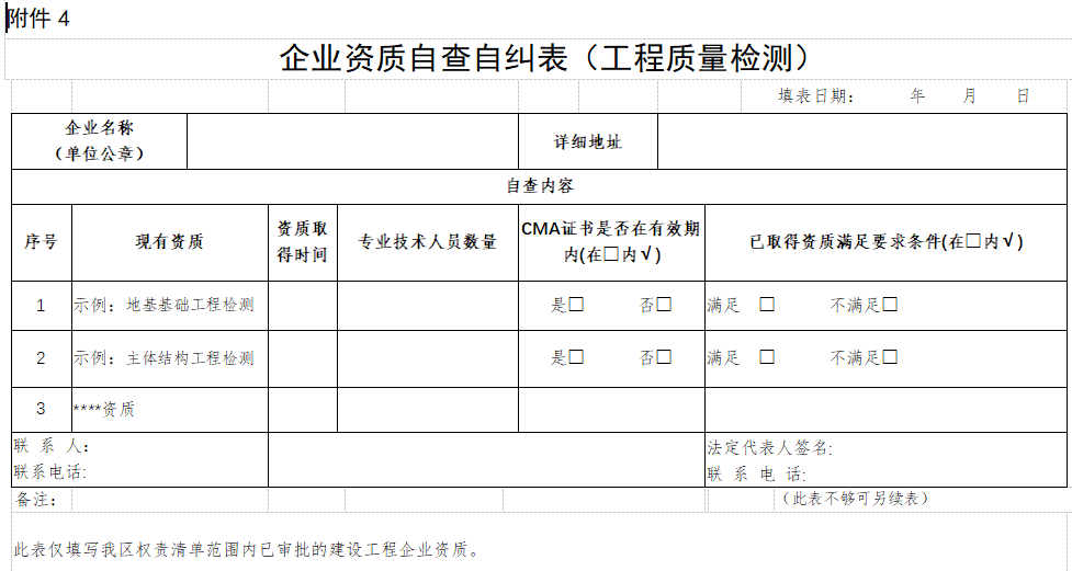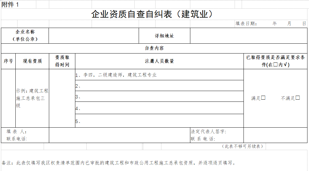 (一)自查自纠阶段(2022年5月-6月)。企业进行自查自纠,按照已取得的资质项数,填写《企业资质自查自纠表》(附件1-4)并附上相关纸质核查材料报送区行政服务中心71号窗口。企业逾期未提交表格和相关核查材料的,将直接列入限期整改名单。