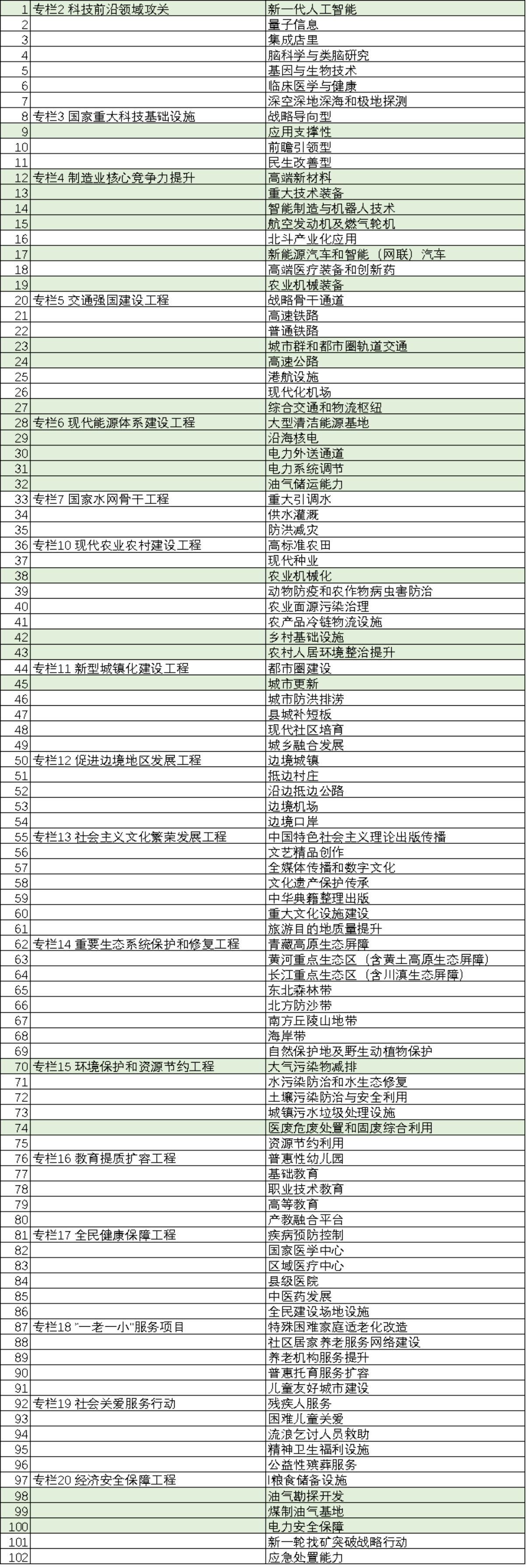 什么是“十四五”规划102项重大工程?“十四五”规划纲要中的20 个专栏,除去经济社会发展主要指标专栏,以及数字经济重点的7 个产业专栏和数字化应用10 大场景专栏外,其余17 个专栏包含的102 项工程即为“十四五”规划102 项重大工程项目。