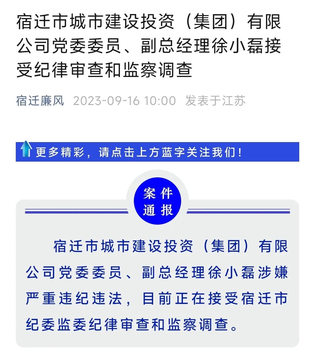 9月16日,宿迁市城市建设投资(集团)有限公司党委委员、副总经理徐小磊被查。