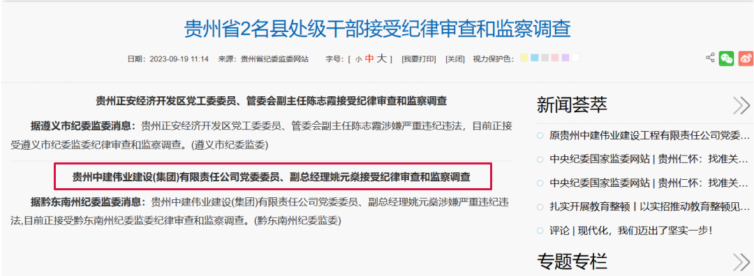 9月19日,据黔东南州纪委监委消息:贵州中建伟业建设(集团)有限责任公司党委委员、副总经理姚元燊涉嫌严重违纪违法,目前正接受黔东南州纪委监委纪律审查和监察调查。