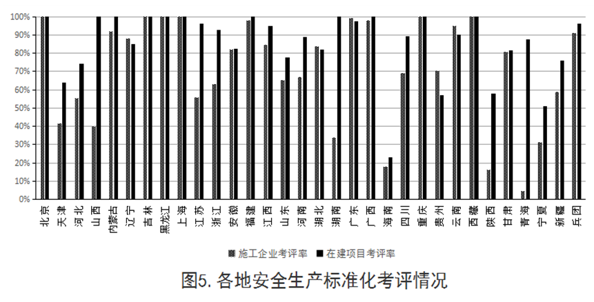 截至2018年第四季度,各地建筑施工企业安全生产标准化考评率平均为71.30%,北京、吉林、黑龙江、上海、重庆、西藏等6个省(区、市)考评率达100%;在建房屋市政工程项目考评率平均为85.80%,北京、山西、内蒙古、吉林、黑龙江、上海、福建、湖南、广西、重庆、西藏等11个省(区、市)考评率达100%。