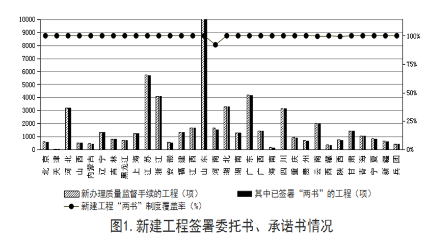 2018年第四季度,全国新办理质量监督手续的工程共58869项,其中,已签署法定代表人授权书、工程质量终身责任承诺书的工程有58721项,覆盖率为99.75%,山东、江苏、广东等28个省(区、市)和新疆生产建设兵团覆盖率达100%。