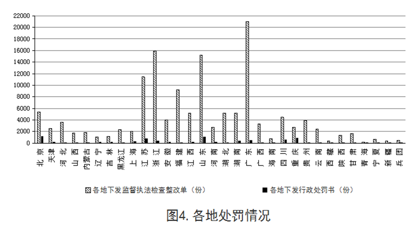2018年第四季度,各地共下发监督执法检查整改单138954份、行政处罚书7842份,处罚相关单位6833个,处罚相关人员2019名。其中,省级住房和城乡建设主管部门下发监督执法检查整改单3007份、行政处罚书601份,处罚相关单位455个,处罚相关人员166名;市县级住房和城乡建设主管部门下发监督执法检查整改单135947份、行政处罚书7241份,处罚相关单位6378个,处罚相关人员1853名。从行政处罚数量看,北京市、山东省、重庆市、江苏省处罚力度较大。