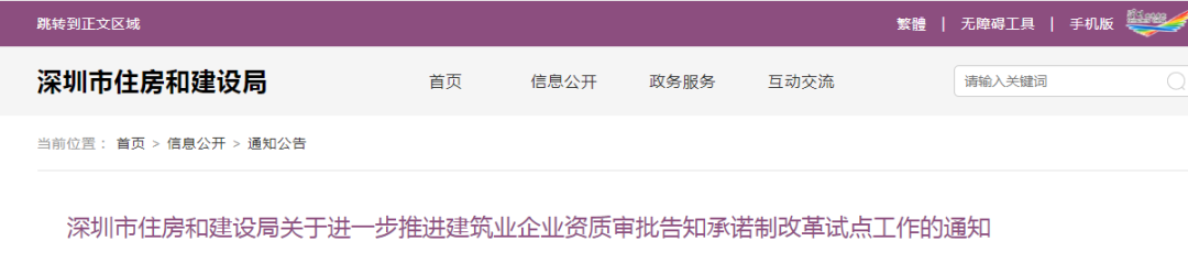 为落实《深圳市人民政府关于印发深圳市开展“证照分离”改革全覆盖试点实施方案的通知》(深府函〔2020〕24号)要求,进一步深化“放管服”改革,优化建筑业企业资质管理,促进我市建筑业高质量发展,在前海蛇口自贸片区开展建筑业资质审批告知承诺制的基础上,我局决定进一步推进建筑业企业资质审批告知承诺制改革试点工作,有关事项通知如下: