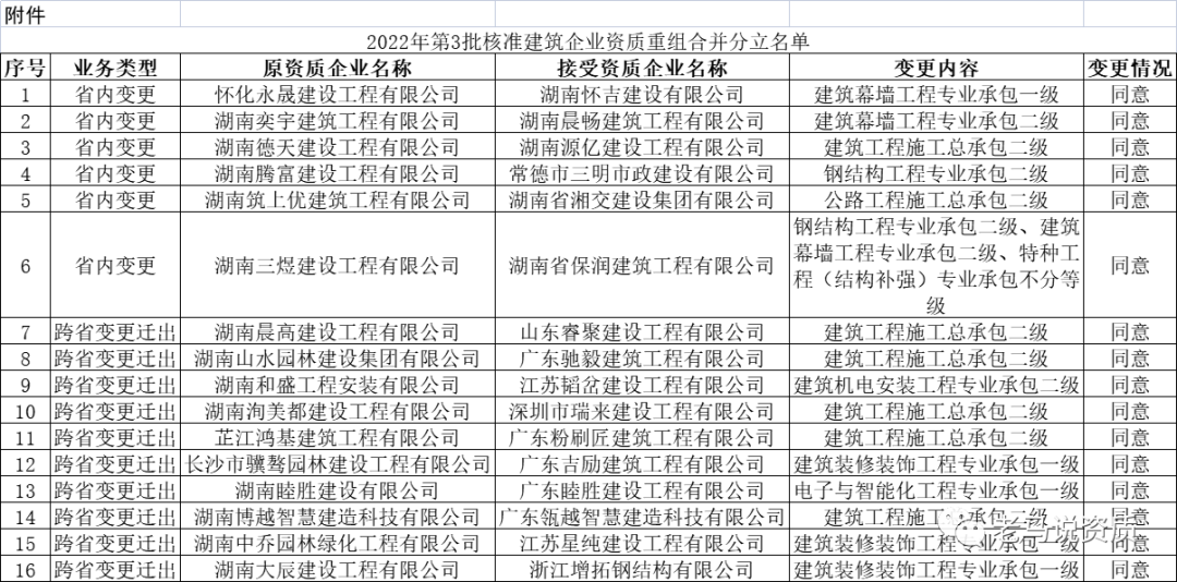 根据《建筑业企业资质管理规定》(住房城乡建设部第22号令)、《住房城乡建设部关于建设工程企业发生重组、合并、分立等情况资质核定有关问题的通知》(建市〔2014〕79号)和《建筑业企业资质管理规定和资质标准实施意见》(建市〔2015〕20号)等有关文件的规定,怀化永晟建设工程有限公司等16家企业,符合发生重组、合并、分立等情况资质核定的要求,现将名单予以公告(详见附件)。