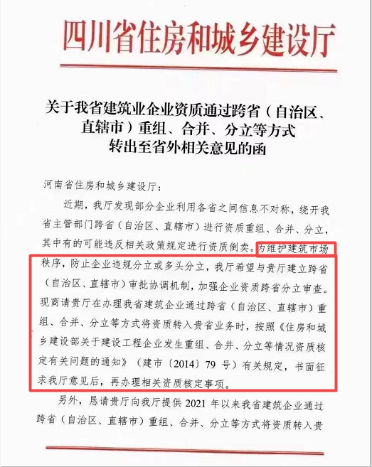 住建厅:防止企业违规分立或多头分立,严格办理资质跨省转移事项!