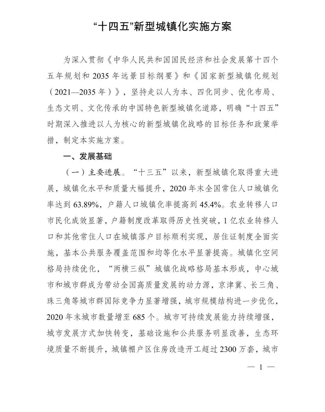 国家发展改革委印发“十四五”新型城镇化实施方案。《方案》重点包括: