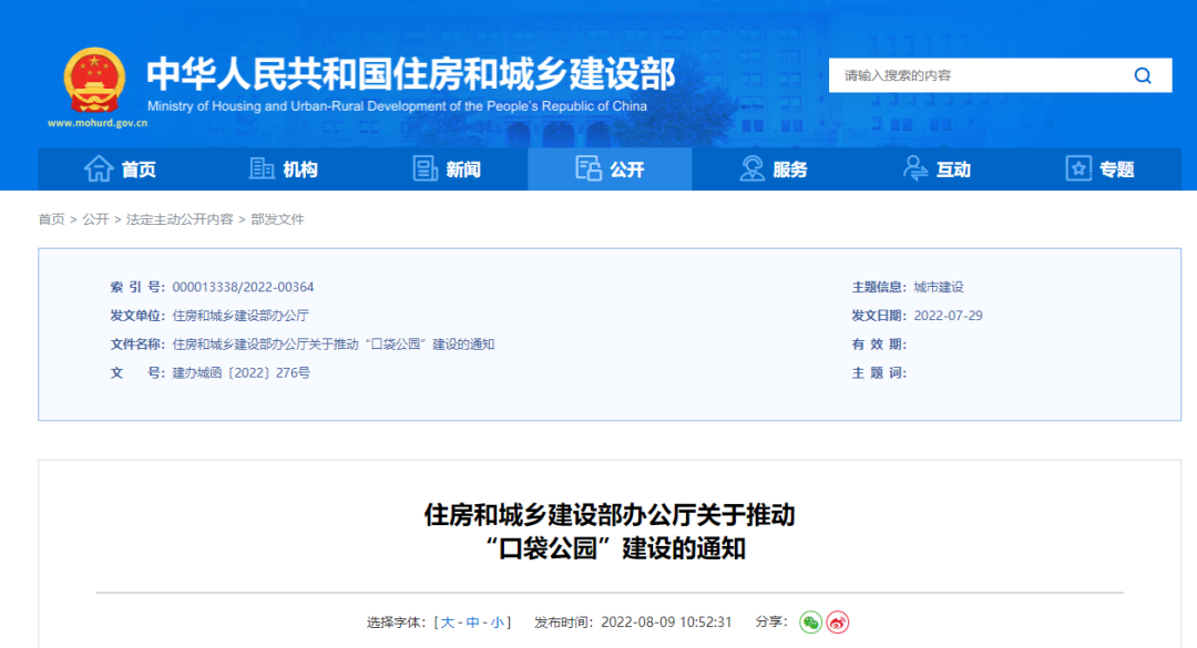 8月9日,住房和城乡建设部发布通知称,将推动全国于2022年建设不少于1000个城市“口袋公园”,为群众提供更多方便可达、管理规范的公园绿化活动场地。通知要求,每个省(自治区、直辖市)力争2022年内建成不少于40个“口袋公园”,新疆、西藏等地可结合实际确定建设计划。
