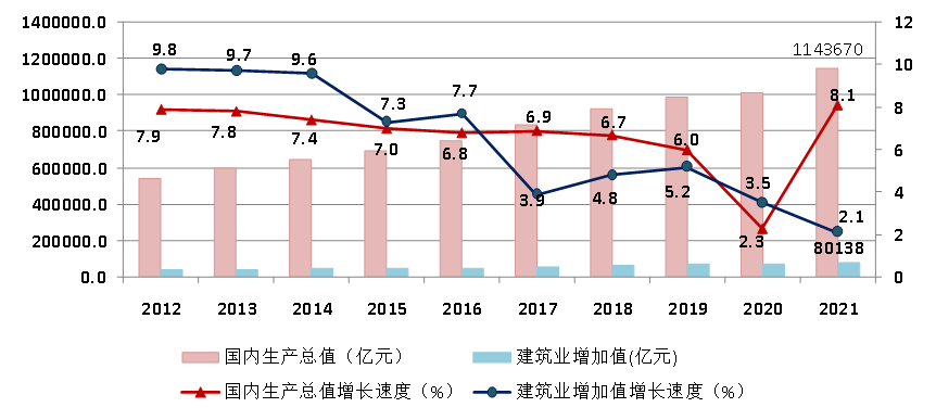 经初步核算,2021年全年国内生产总值1143670亿元,比上年增长8.1%(按不变价格计算)。全年全社会建筑业实现增加值80138亿元,比上年增长2.1%,增速低于国内生产总值6个百分点(图1)。