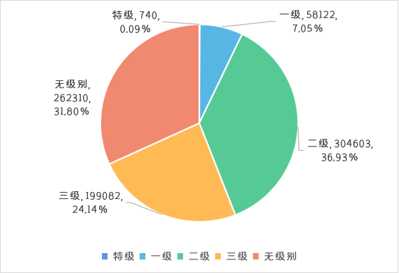 2021年全国具备资质的建筑工程行业企业总数量为824857,其中特级企业数量为740家,占比0.09%;一级企业数量为58122家,占比7.05%;二级企业数量为304603家,占比36.93%;三级企业数量为199082家,占比24.14%;无级别企业数量为262310家,占比31.80%。