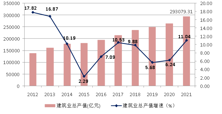 近年来,随着我国建筑业企业生产和经营规模的不断扩大,建筑业总产值持续增长。2021年达到293079.31亿元,比上年增长11.04%。建筑业总产值增速比上年提高了4.80个百分点,连续两年上升(图3)。