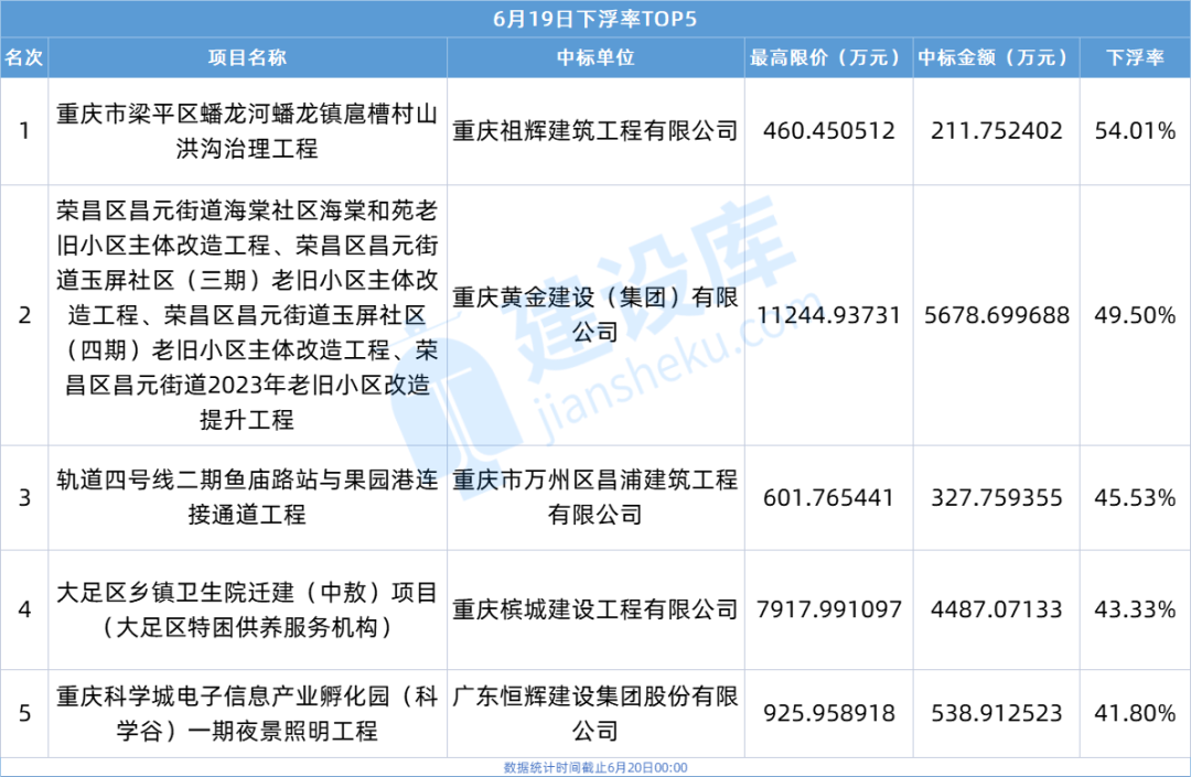 ▶ 下浮率最高的项目为重庆市梁平区蟠龙河蟠龙镇扈槽村山洪沟治理工程,下浮率54.01%;