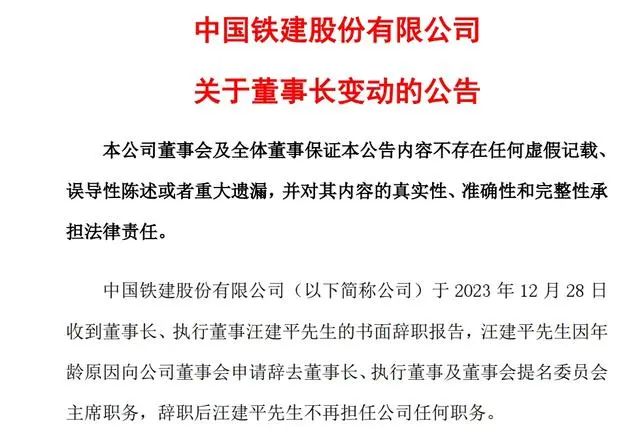 12月28日,中国铁建发布公告称,中国铁建股份有限公司 (以下简称公司)于2023年12月28日收到董事长、执行董事汪建平先生的书面辞职报告,汪建平先生因年龄原因向公司董事会申请辞去董事长、执行董事及董事会提名委员会主席职务,辞职后汪建平先生不再担任公司任何职务。
