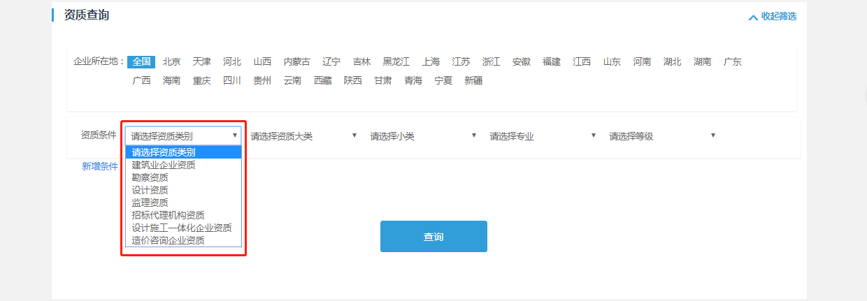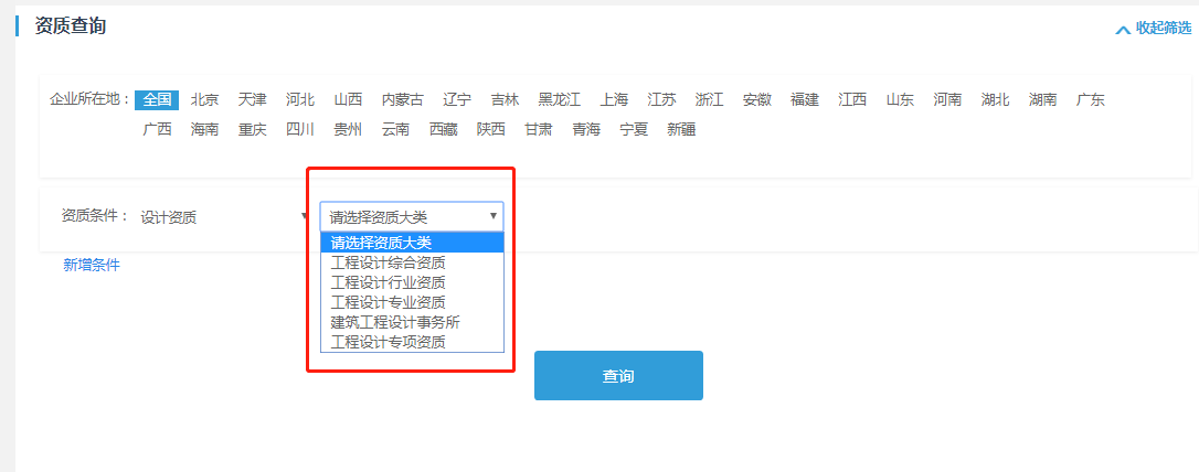 资质搜索新增228种设计、勘察、监理等资质筛选条件