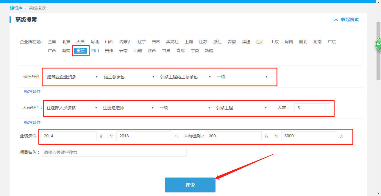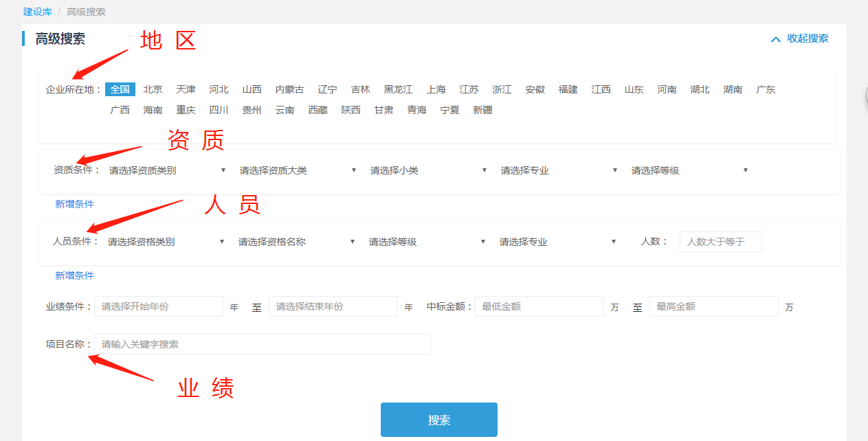 支持同时按地区、资质、人员、业绩条件搜索符合的企业