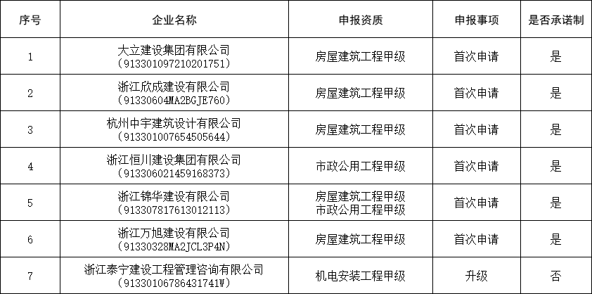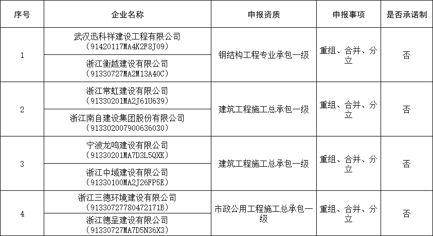 公告显示,4家建筑业企业申报资质重组、合并、分立,其中3家施工总包壹级,1家专业承包壹级;7家监理企业首次申请、升级甲级资质。