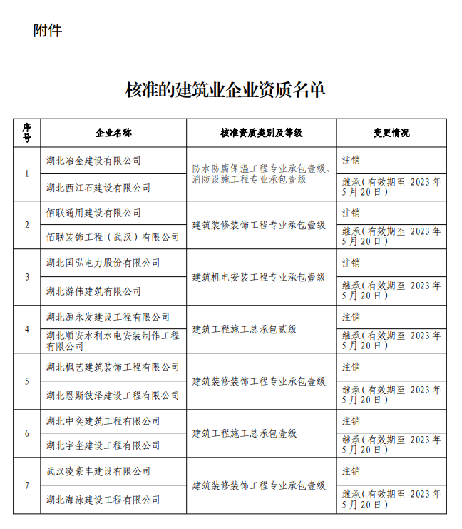 根据《中华人民共和国行政许可法》、《建筑业企业资质管理规定》(住建部第22号令)、住建部《建筑业企业资质标准》(建市〔2014〕159号)、《住房和城乡建设部关于建设工程企业发生重组、合并、分立等情况资质核定有关问题的通知》(建市〔2014〕79号)、《住房和城乡建设部办公厅关于扩大建设工程企业资质审批权限下放试点范围的通知》(建办市函〔2021〕93号)等法律、法规及有关资质管理规定,现将我厅核准的建筑业企业资质予以公布。