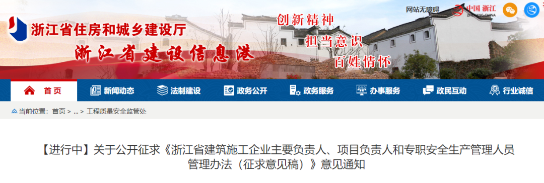 为进一步规范我省建筑施工企业“三类人员”管理,切实提高建筑施工从业人员综合素质和技能水平,保障工程质量和施工安全,根据建设部《建筑施工企业主要负责人、项目负责人和专职安全生产管理人员安全生产管理规定》、《建筑施工企业主要负责人、项目负责人和专职安全生产管理人员安全生产管理规定实施意见》等规定,我厅起草了《浙江省建筑施工企业主要负责人、项目负责人和专职安全生产管理人员管理办法(征求意见稿)》,现向社会公开征求意见。意见征集时间:2022年5月25日-2022年6月8日。以上期限内,任何单位和个人可以通过以下方式提出意见: