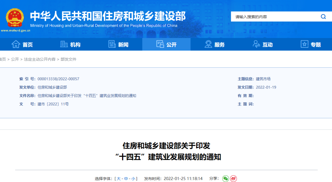 住建部官网发布《住房和城乡建设部关于印发“十四五”建筑业发展规划的通知》。其中主要任务之一就是要加快智能建造与新型建筑工业化协同发展。