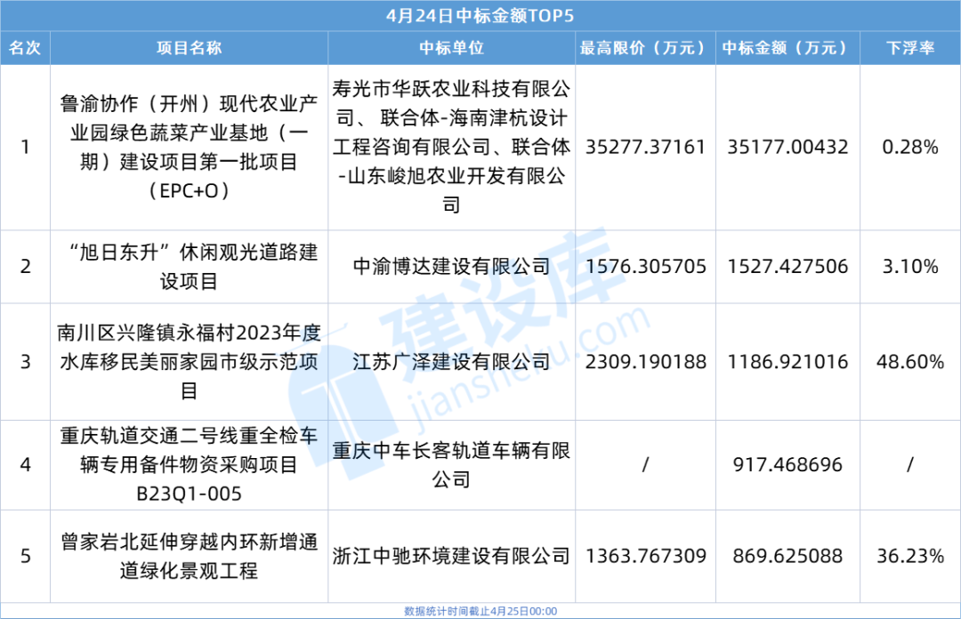 ▶ 中标金额最大的项目为鲁渝协作(开州)现代农业产业园绿色蔬菜产业基地(一期)建设项目第一批项目(EPC+O),中标金额35177.00432万元。