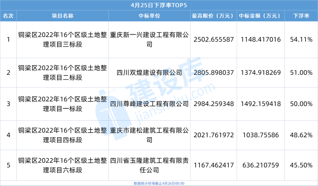 ▶ 下浮率最高的项目为铜梁区2022年16个区级土地整理项目三标段,下浮率54.11%;