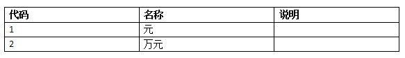 2、码值:代码对应的代码表。代码表有3个字段,“名称”字段表示编码对象的中文名称;“代码”字段表示编码对象的代码,可以是数字码、字母码或数字字母混合码;“说明”字段表示需要特殊说明的内容。其中,“名称”和“代码”是必选字段,“说明”是可选字段。如下表所示: