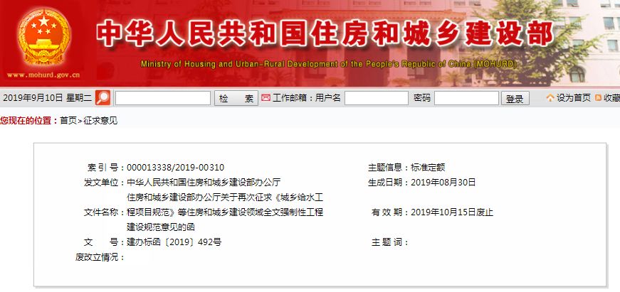 9月10号,住建部官网发布:征求《城乡给水工程项目规范》等住房和城乡建设领域全文强制性工程建设规范意见的函,参照国际通行做法,工程规范发布后将替代现行强制性条文,并作为约束推荐性标准和团体标准的基本要求。