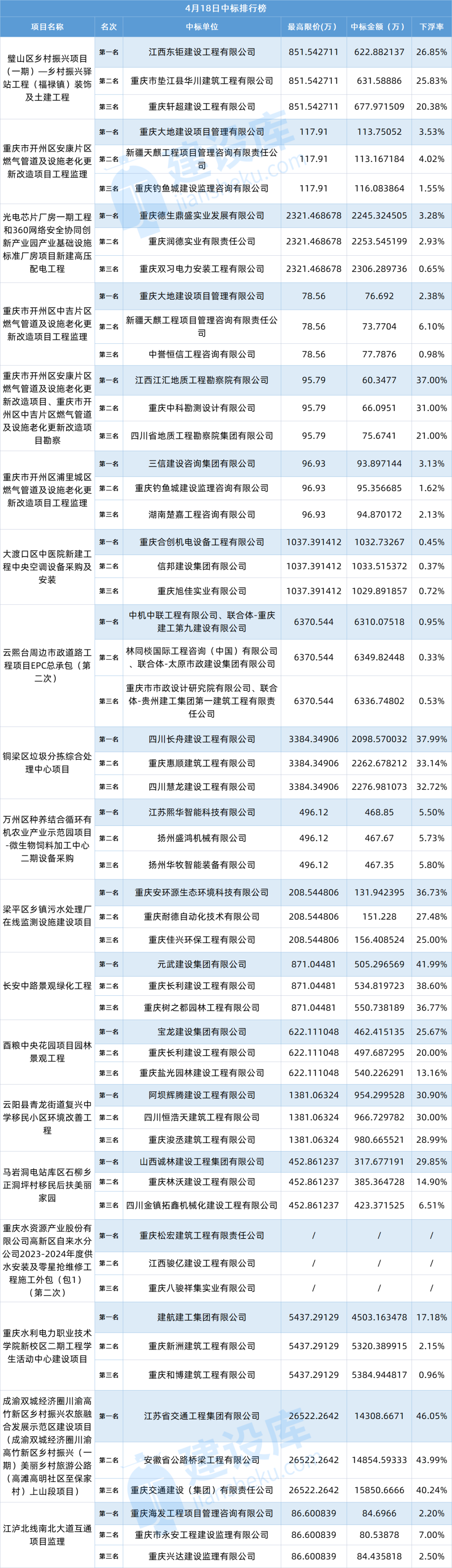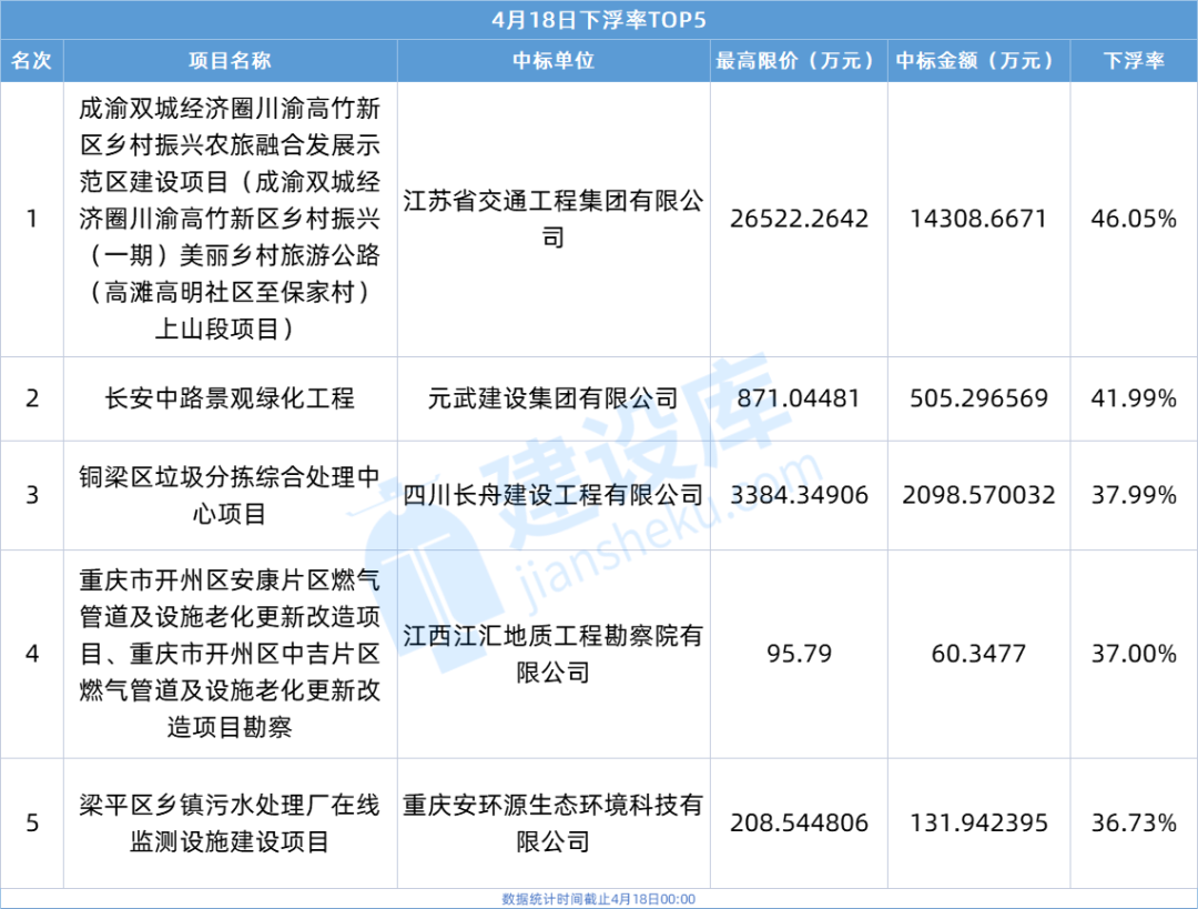 ▶ 下浮率最高的项目为成渝双城经济圈川渝高竹新区乡村振兴农旅融合发展示范区建设项目(成渝双城经济圈川渝高竹新区乡村振兴(一期)美丽乡村旅游公路(高滩高明社区至保家村)上山段项目),下浮率46.05%;