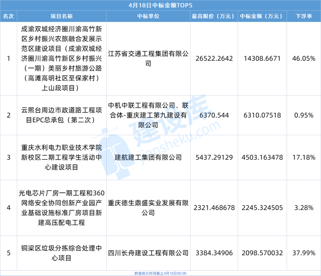 【4月18日重庆中标详情】据建设库大数据综合服务平台统计,截止到2023年4月18日19:30分,重庆公共资源交易网中标公示项目共19个,其中施工项目11个,监理4个,其他4个;出现废标情况的项目有8个。