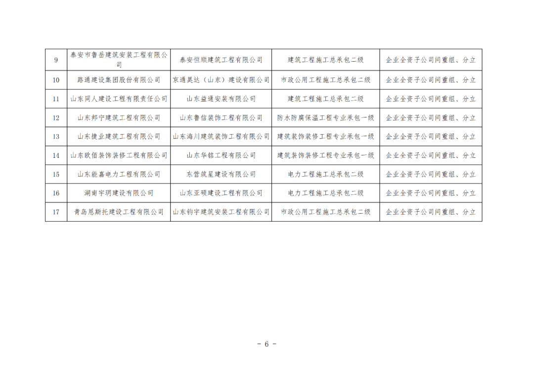 予以核准山东一滕建设集团有限公司等17家建筑业企业通过重组、合并、分立方式获得资质;