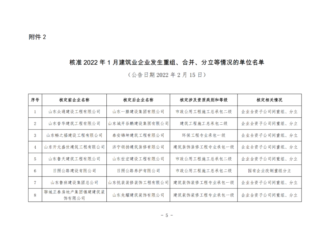 2.核准2022年1月建筑业企业发生重组、合并、分立等情况的单位名单(公告日期2022年2月15日)