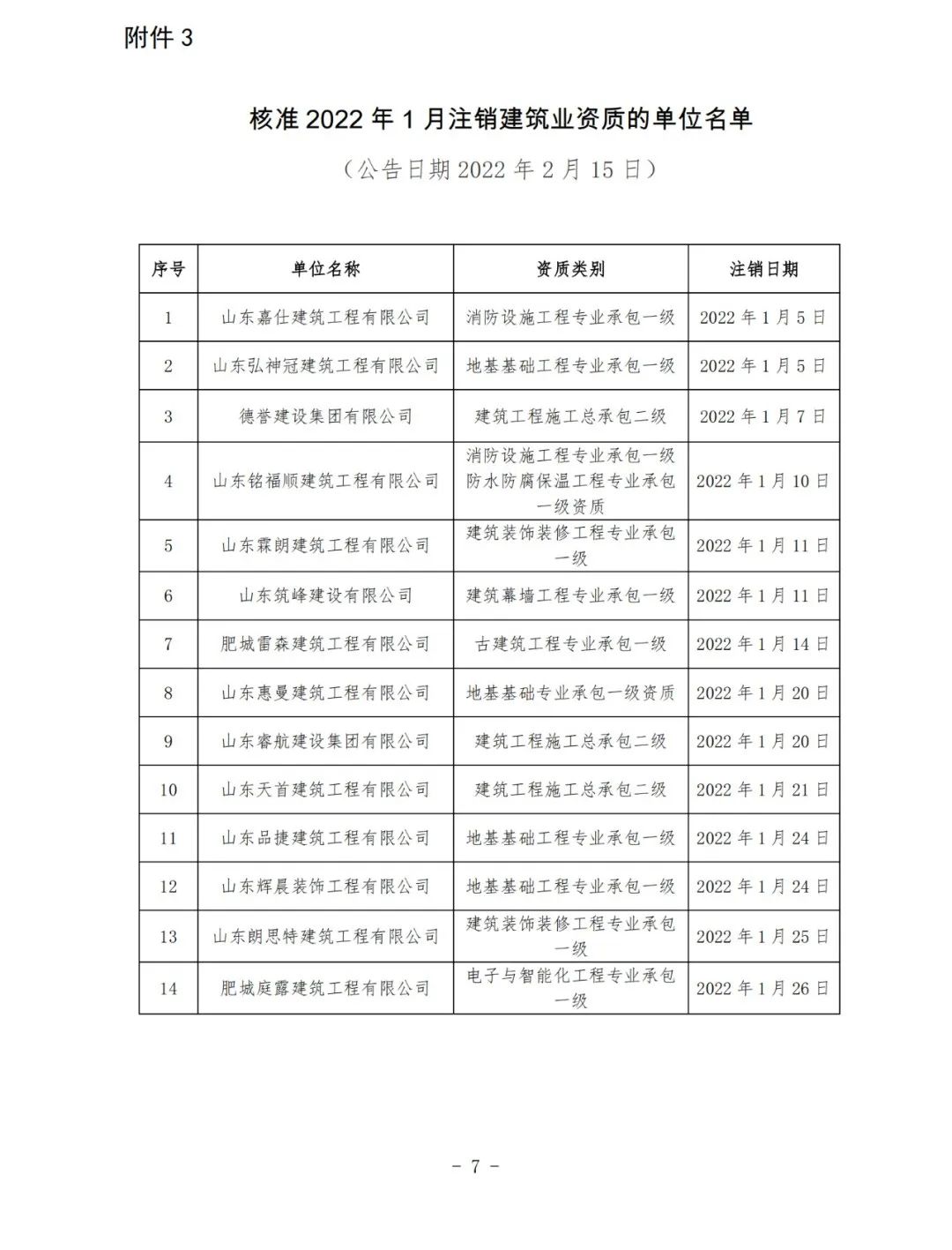 3.核准2022年1月注销建筑业资质的单位名单(公告日期2022年2月15日)