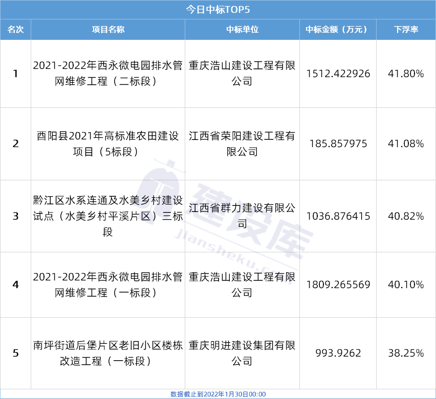 截止到2022年1月30日00:00点整,全重庆施工项目中标公示总数为38个。今日中标价下浮超过15%的项目为26个。