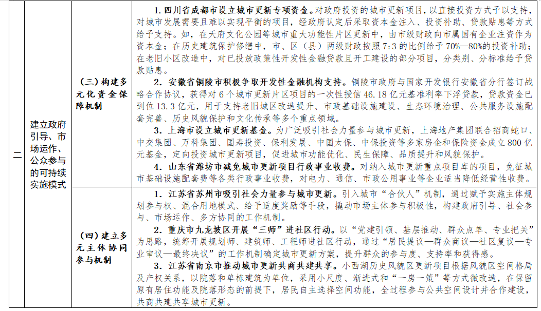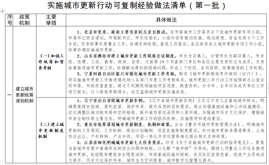 近日,住房和城乡建设部总结城市更新试点城市和各地经验做法,印发《实施城市更新行动可复制经验做法清单(第一批)》。