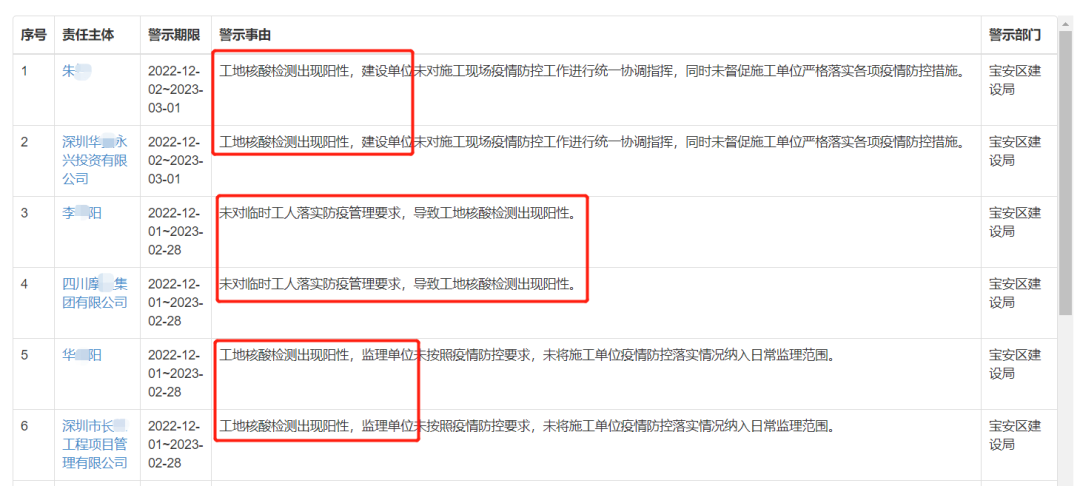 此外,深圳市住建局对3家单位及3名个人予以红色警示。