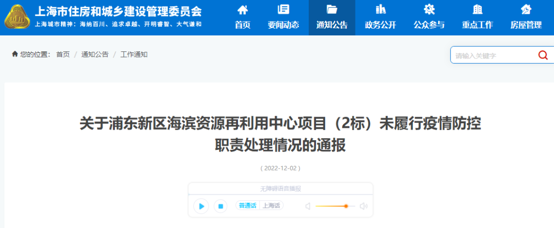 近日,浦东新区海滨资源再利用中心项目(2标)在疫情防控中落实主体责任措施不力,导致工地产生多例阳性病例,造成社会严重不良影响,依据《关于进一步加强本市建筑工程疫情防控工作的通知》(沪建质安﹝2022﹞184号)等疫情防控相关要求,现对相关处理情况作以下通报: