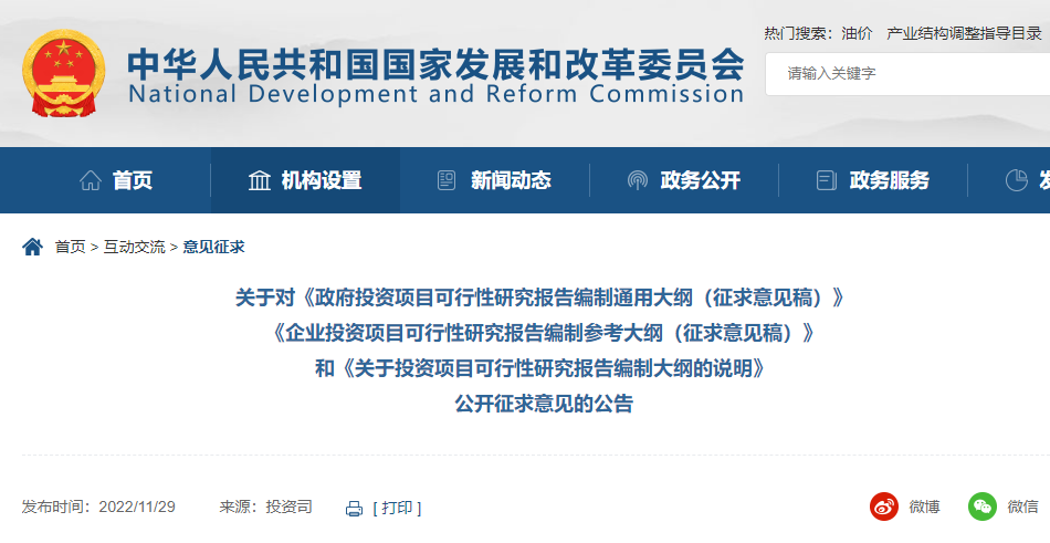 11月29日,国家发改委发布了《政府投资项目可行性研究报告编制通用大纲(征求意见稿)》《企业投资项目可行性研究报告编制参考大纲(征求意见稿)》和《关于投资项目可行性研究报告编制大纲的说明》。